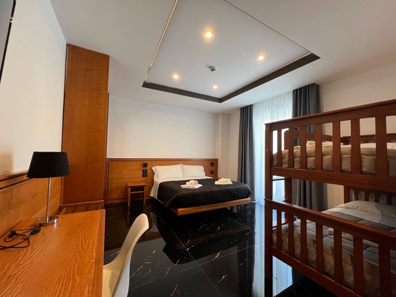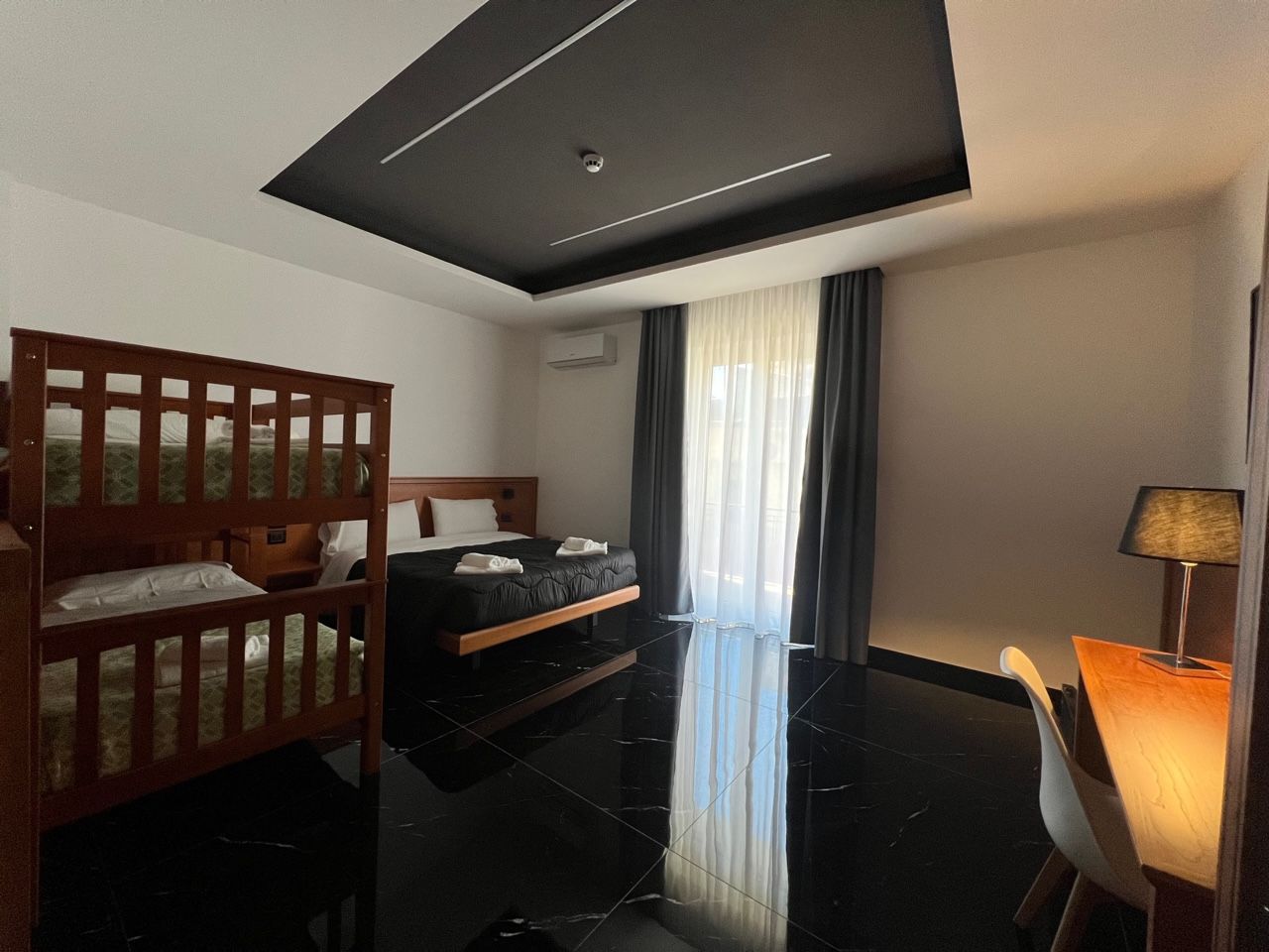 Camera quadrupla di tipologia DELUXE con BALCONE, totalmente rinnovata dagli arredi eleganti, climatizzatore, 1 letto matrimoniale e 1 letto a castello. Dispone di bagno privato interno con box doccia, aria condizionata direttamente programmabile, smart tv, minibar, telefono, phon, fi. NON accettiamo animali per questa tipologia di camera.